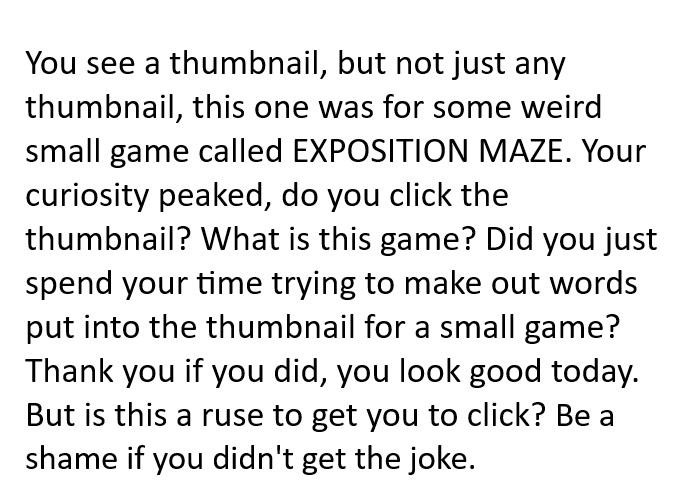 A little thing i threw together, and i felt it was a neat little thing to showcase a concept. Curious what others would think of it. it's short in it's current form. And i'm considering just taking it back down as this is potentially just a total waste of time. But i had fun making it, and i played through it once or twice. Though sadly it's more about the beginning than it is the full journey. Hope your enjoy it while i have it up.